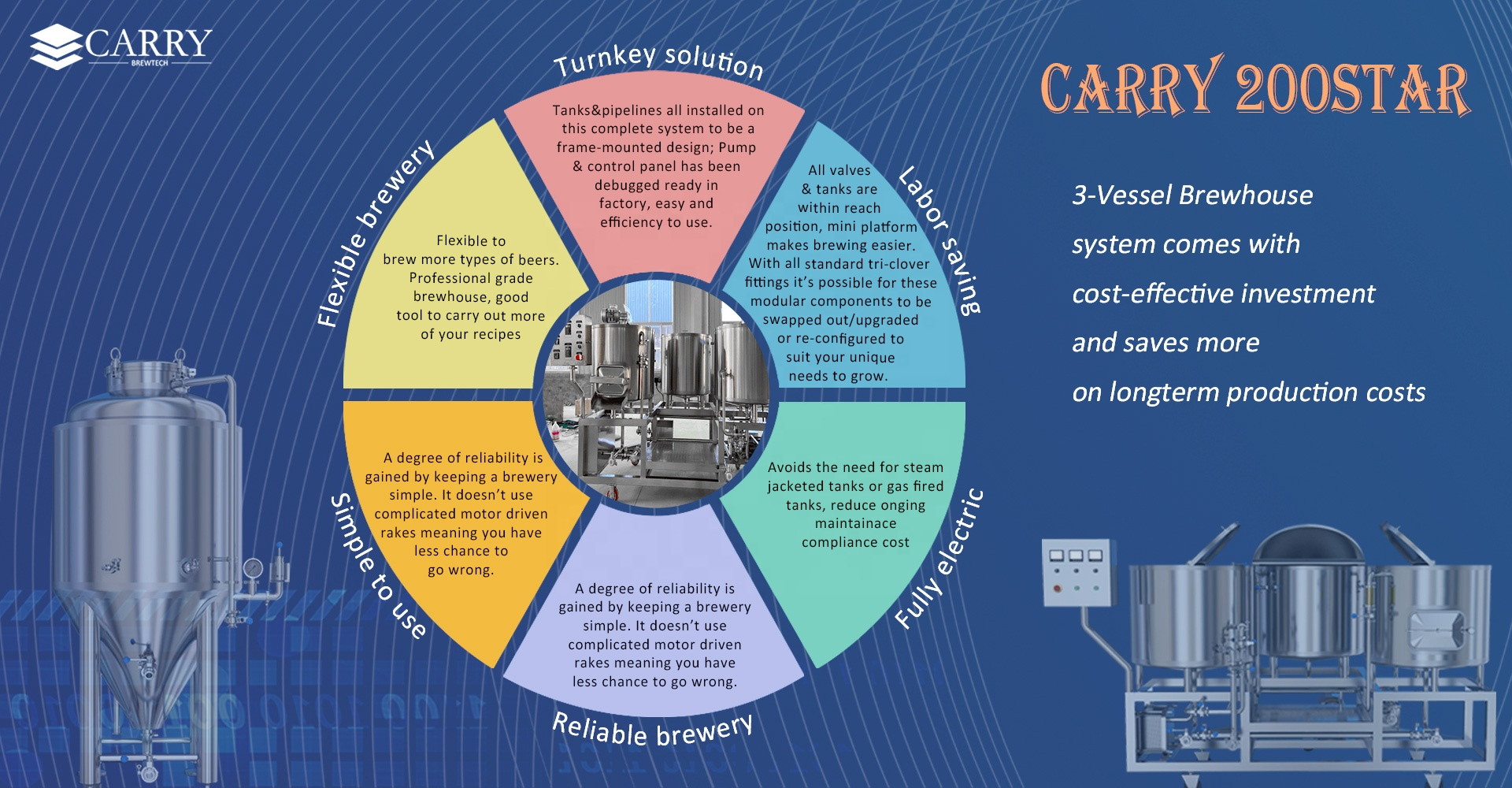 CARRY Brewtech 250L Star-series 3 Vessel Brewhouse is specially customized for homebrew hobbies, entry-level Micro Breweries, Pilot Brewing System, or a full-scale Nano-Brewery production.