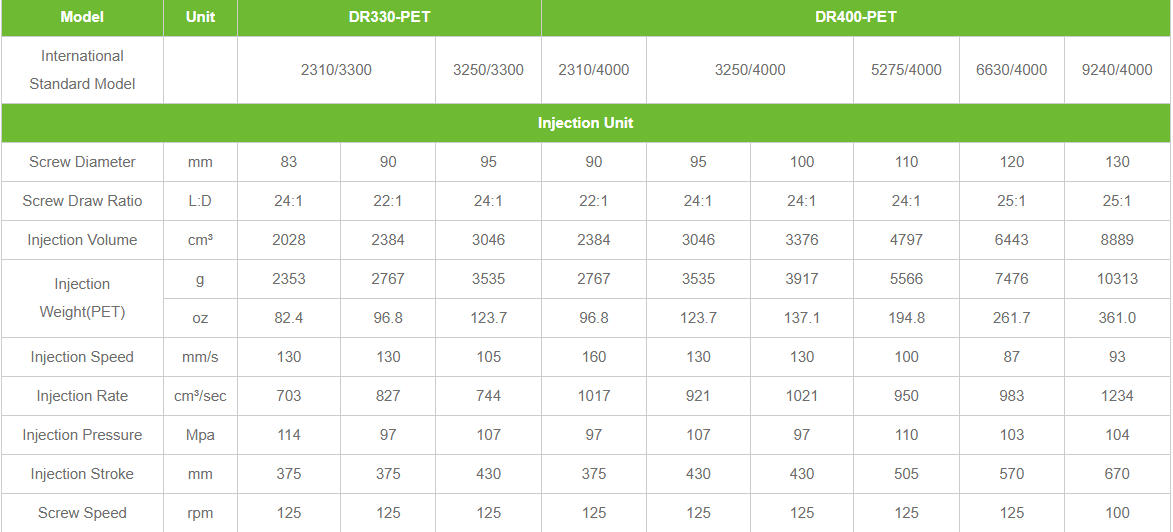 DR-PET Electric Plasticizing Preform Injection Molding Machines Parameter
