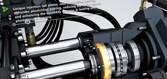 The injection tail platen has an a centering bearing, in addition to the standard positioning bearing, that improves the plasticizing positioning, reduces radial runout, and increases the longevity of the screw assembly and bearing.