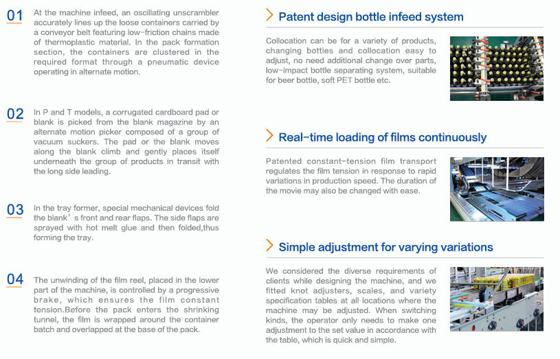 Shrink Wrapping machine is a piece of automatic packaging equipment which can be applied to PET bottles, glass bottles and zip-top cans etc.