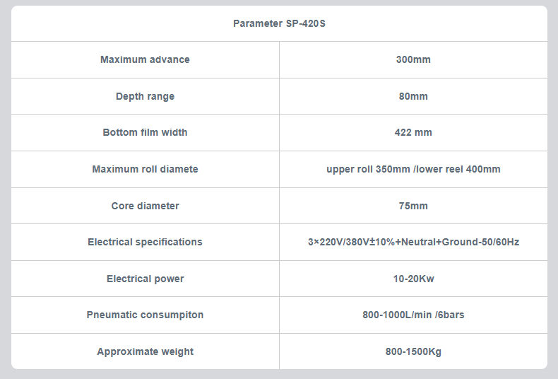 This packaging machine is a fully automatic vacuum packaging machine and is applicable for vacuum, gas-filling and skin packaging of foods, meat products, seafoods, fruits, vegetables, pickles, cooled meat, medicine products, metal elements, and medical apparatus